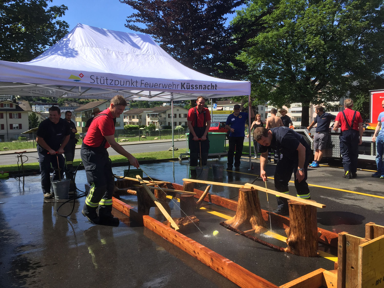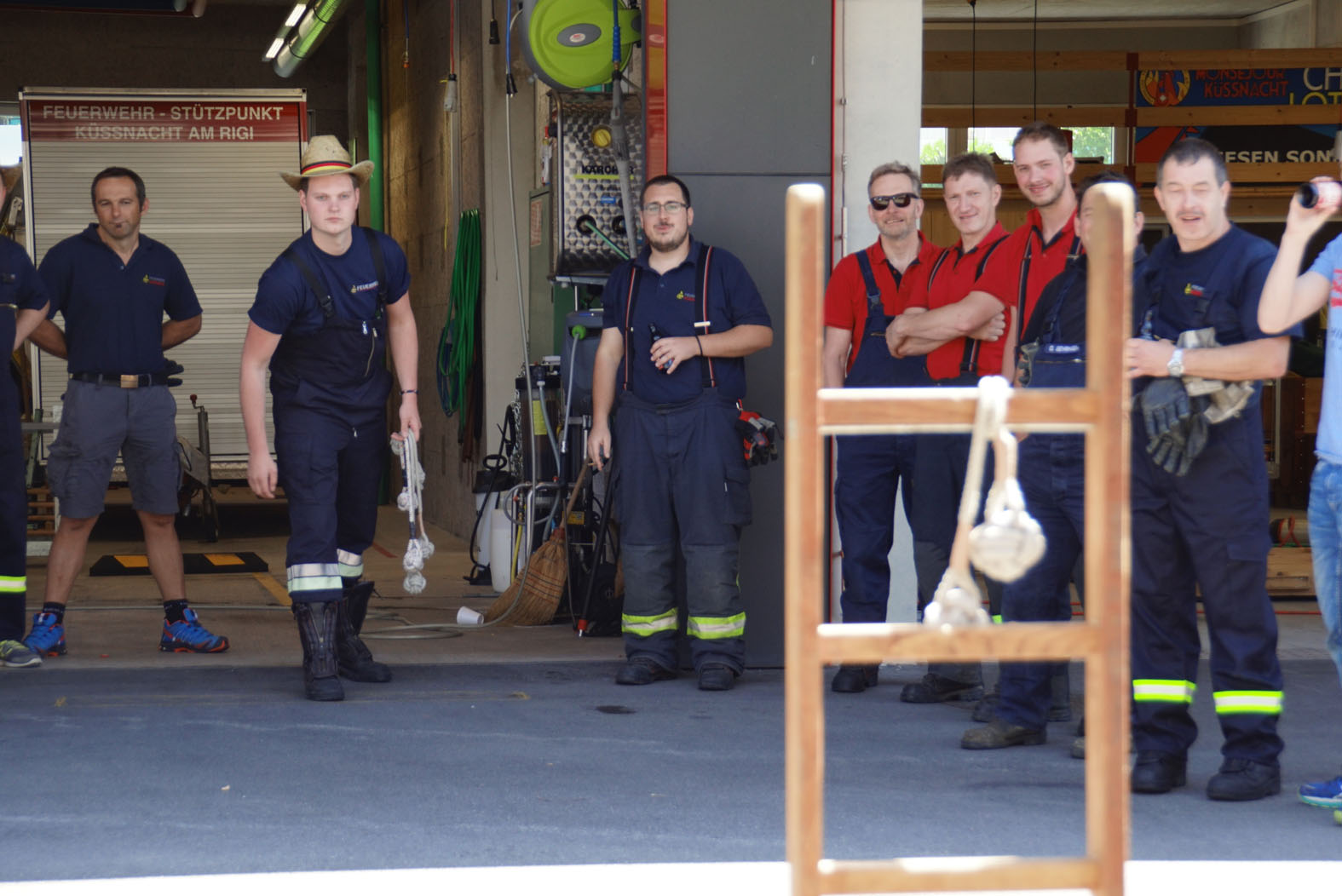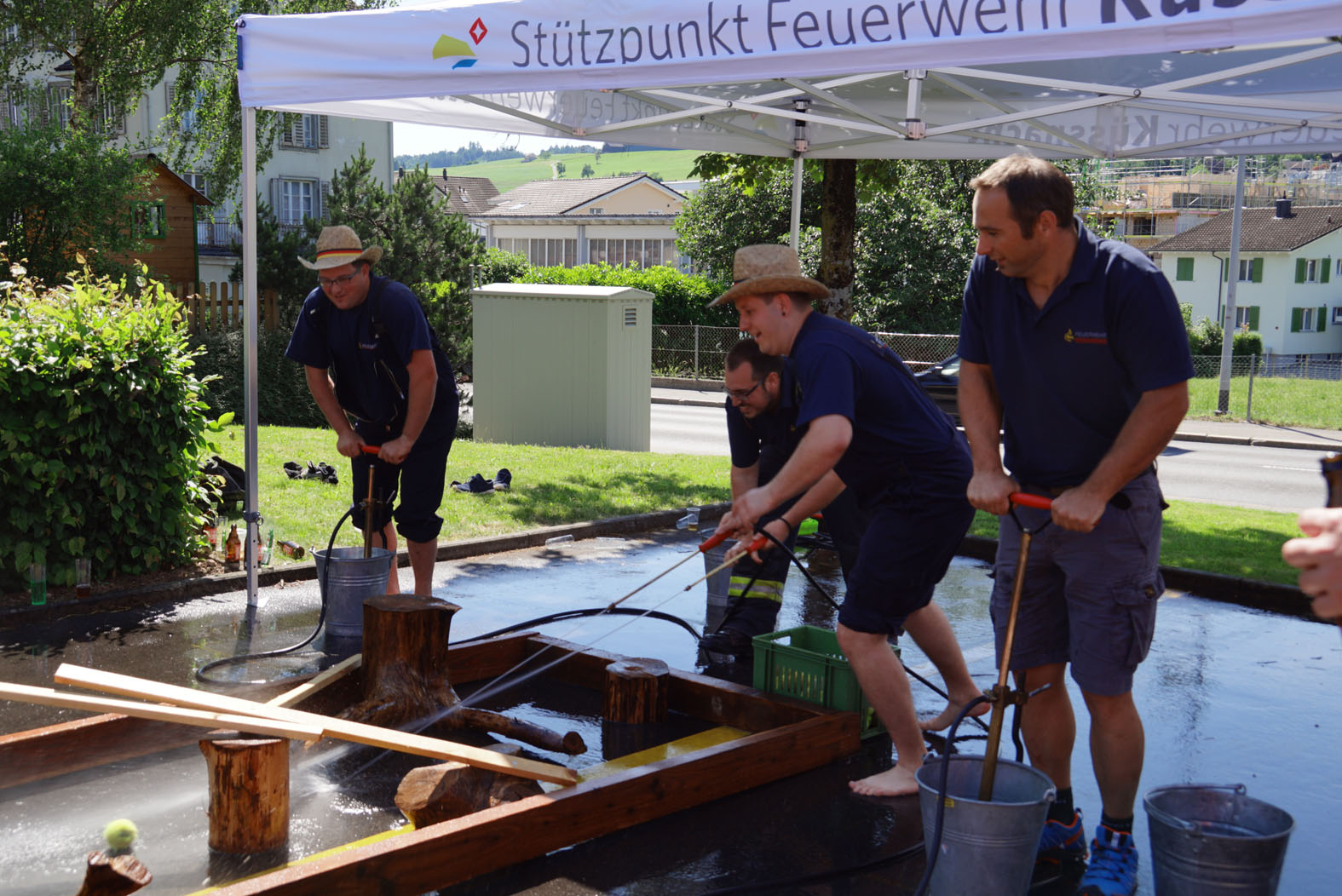 Am Samstag besuchten 17 Kameraden unsere Partnerfeuerwehr in Küssnacht / Rigi (CH), die ihren alljährlichen Plauschwettkampf ausrichteten. Bei strahlendem Sonnenschein absolvierten wir mehr oder weniger nassgespritzt ausgeklügelte Aufgaben wie Bierkistenstapeln, Minigolf , bei dem ein Tennisball mittels Eimerspritzen fortbewegt werden musste oder das Anheben einer Leiter per hydraulischem Gerät. Auch konnten wir unsere Geschicklichkeit beim Baggerführen unter Beweis stellen. Schlussendlich erreichten wir von 23 Gruppen den respektablen 9. und 4. Platz. Selbstverständlich kam auch der kameradschaftliche Teil nicht zu kurz, und Kontakte konnten gepflegt und geknüpft werden.