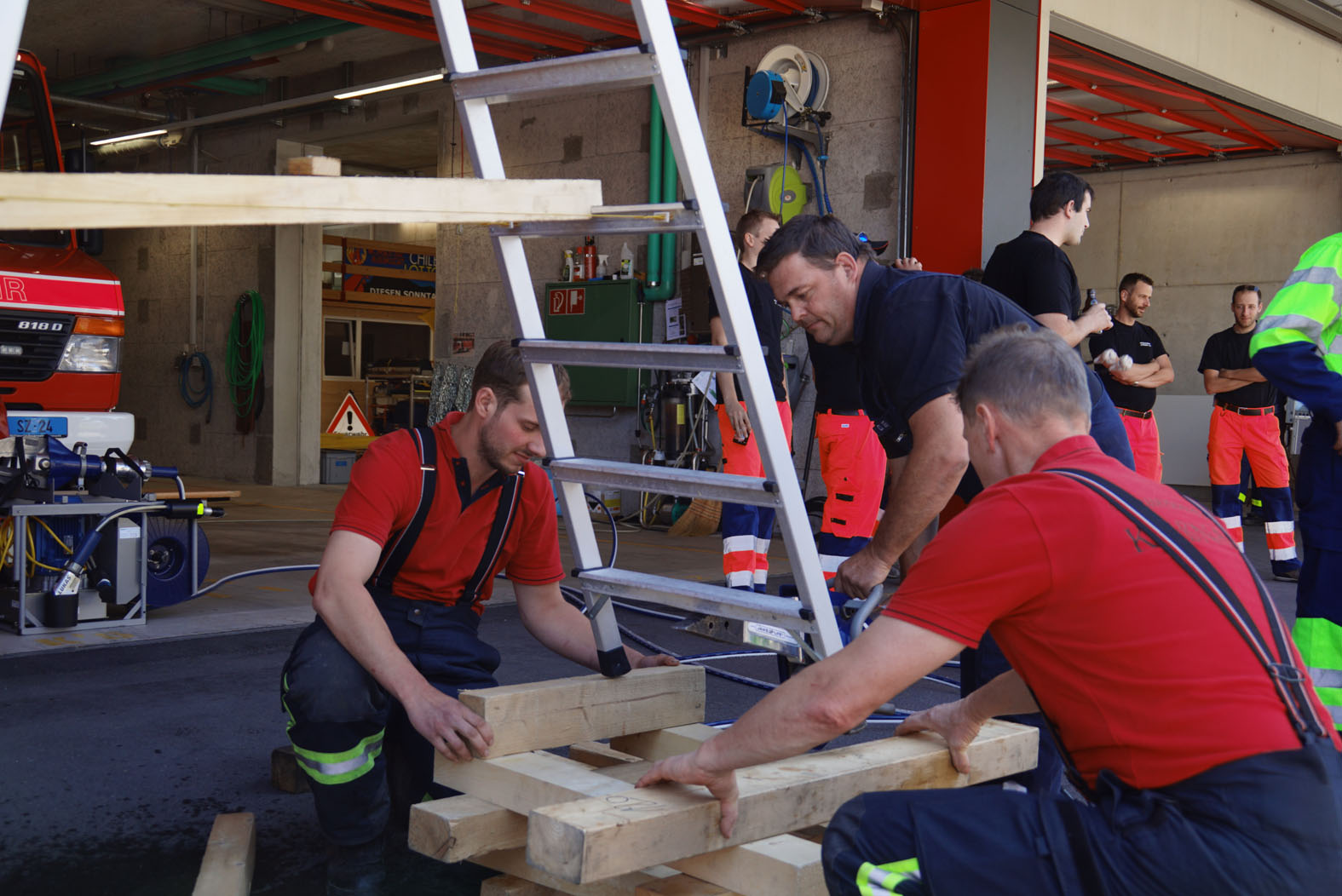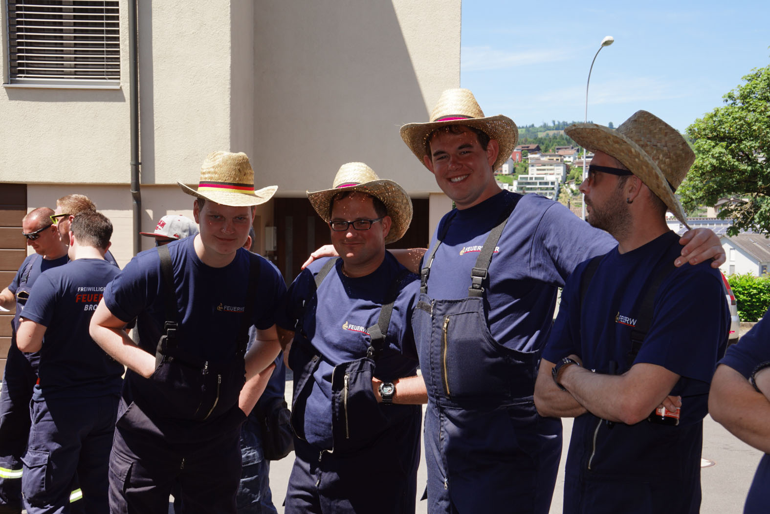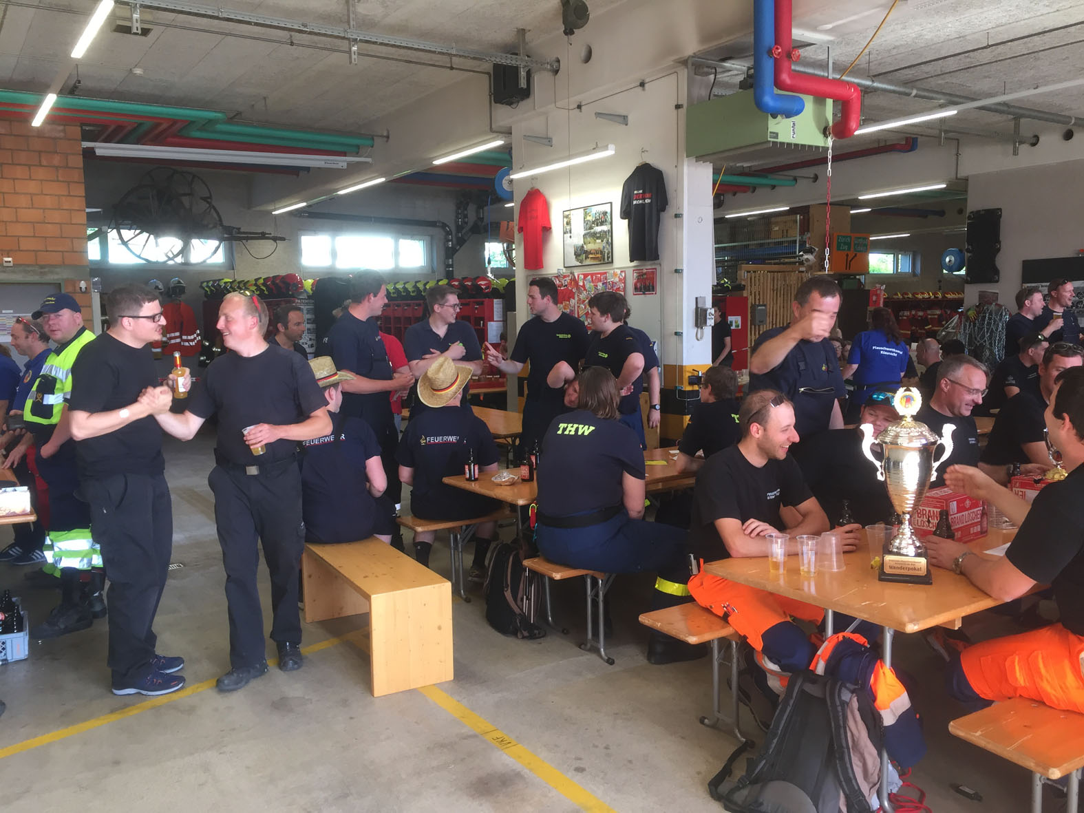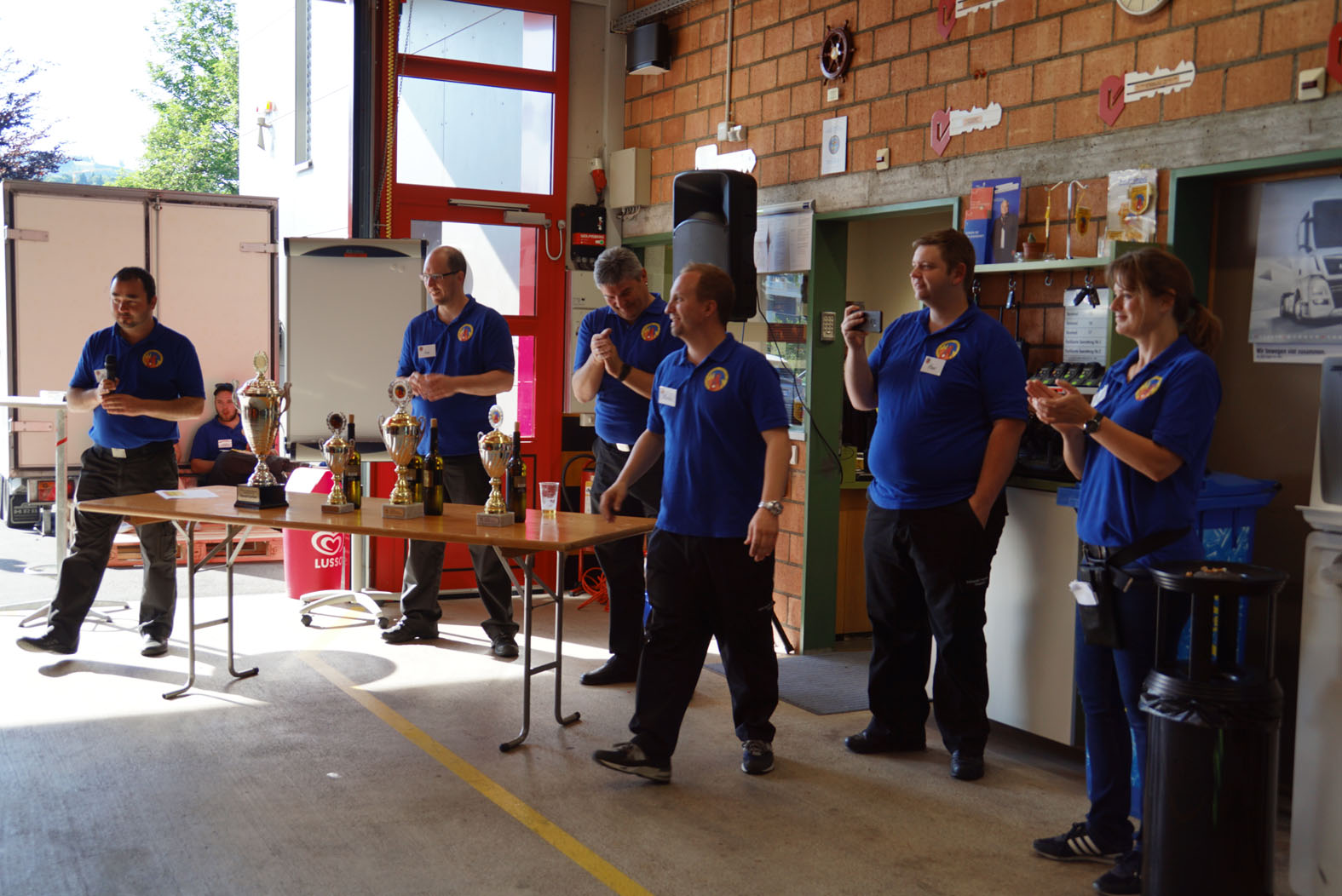 Am Samstag besuchten 17 Kameraden unsere Partnerfeuerwehr in Küssnacht / Rigi (CH), die ihren alljährlichen Plauschwettkampf ausrichteten. Bei strahlendem Sonnenschein absolvierten wir mehr oder weniger nassgespritzt ausgeklügelte Aufgaben wie Bierkistenstapeln, Minigolf , bei dem ein Tennisball mittels Eimerspritzen fortbewegt werden musste oder das Anheben einer Leiter per hydraulischem Gerät. Auch konnten wir unsere Geschicklichkeit beim Baggerführen unter Beweis stellen. Schlussendlich erreichten wir von 23 Gruppen den respektablen 9. und 4. Platz. Selbstverständlich kam auch der kameradschaftliche Teil nicht zu kurz, und Kontakte konnten gepflegt und geknüpft werden.