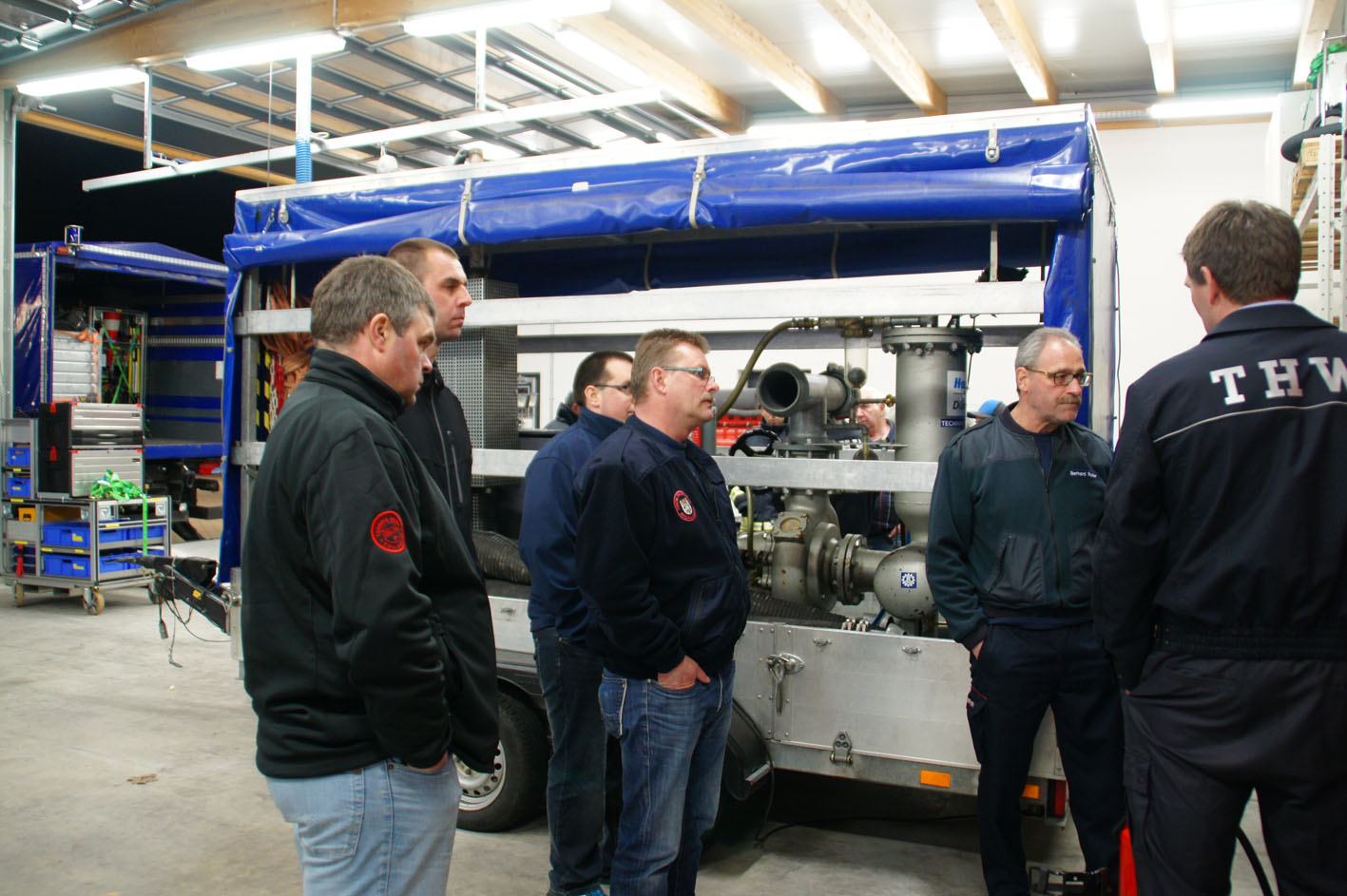 Am 24. März 2017 besuchten 11 Kameraden unserer Wehr das THW des OV Waldshut-Tiengen im Kaitle. In einem kurzweiligen Vortrag erklärten uns die Ortsbeauftragten Christian Hipp und Alexander Schmidt die Organisation, Aufbau und Einsatzgebiete des THW im Allgemeinen und speziell für den Standort im Kaitle vor. Anschließend durften wir noch die Räumlichkeiten, Fahrzeuge, Anhänger und Ausrüstungen genau unter die Lupe nehmen, dabei waren besonders der eigens umgebaute, 10 m hohe Lichtmast und die Schmutzwasserpumpen mit Förderleistungen von 5.000 bzw. 10.000 Liter/min die Highlights. Beim Umtrunk ließen die Kameraden beider Organisationen den Abend noch ausklingen. Vielen Dank an Christian und Alexander für den interessanten Abend und die kameradschaftliche Begegnung.