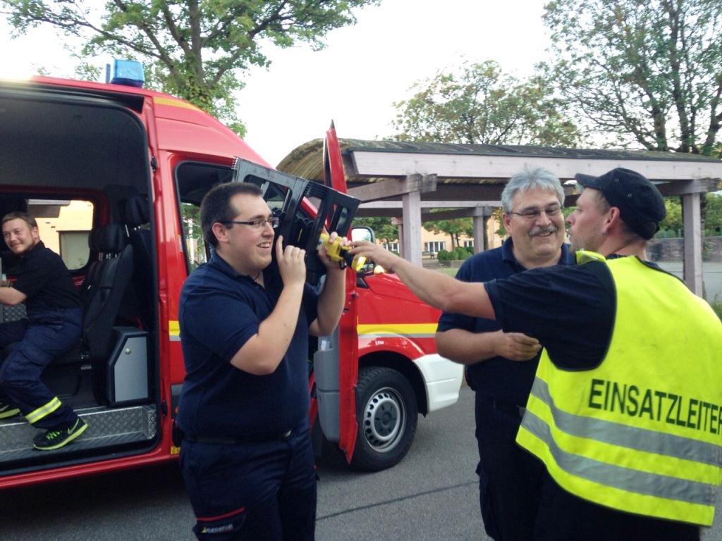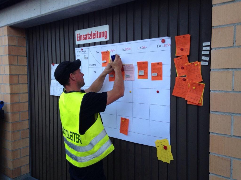 Um das immense Aufgabenspektrum erfolgreich zu bewältigen, wurde Einsatzleiter Sven Haberstock durch eine kleine Führungsgruppe bestehend aus drei Funkern/Meldern, einer Lagekartenführerin sowie dem Leiter der Führungsgruppe, Zugführer Tobias Gisy, unterstützt. Neben der Dokumentation der ganzen Lagemeldungen waren auch die Nachforderungen von weiteren Einsatzkräften und anderen Hilfsorganisationen deren Aufgabe. Auch war zwischendurch die Presse mit einem „Kamerateam“, gespielt von den Übungsorganisatoren Rolf Küpfer und Klaus Klauser, vor Ort und informierte sich über die aktuelle Lage im Unwettergebiet Küssaberg…