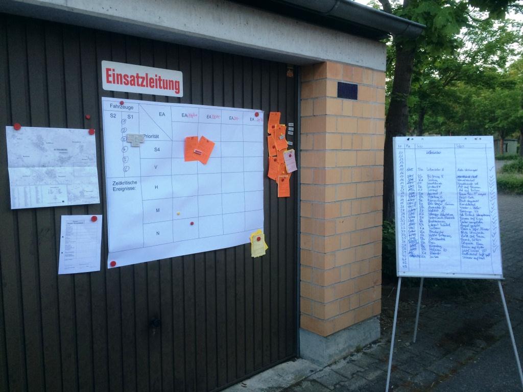 Die beiden Sprechfunkausbilder Heiko Martini und Rolf Küpfer legten im Vorfeld bereits etliche verschiedene Unwettereinsätze, wie beispielsweise vollgelaufene Keller, Bäume über Straßen, eingeschlossene Personen, Tiere in Not, kleinere Brandeinsätze usw. an. Diese wurden dann in unregelmäßigen Abständen an die Einsatzleitung durchgegeben.