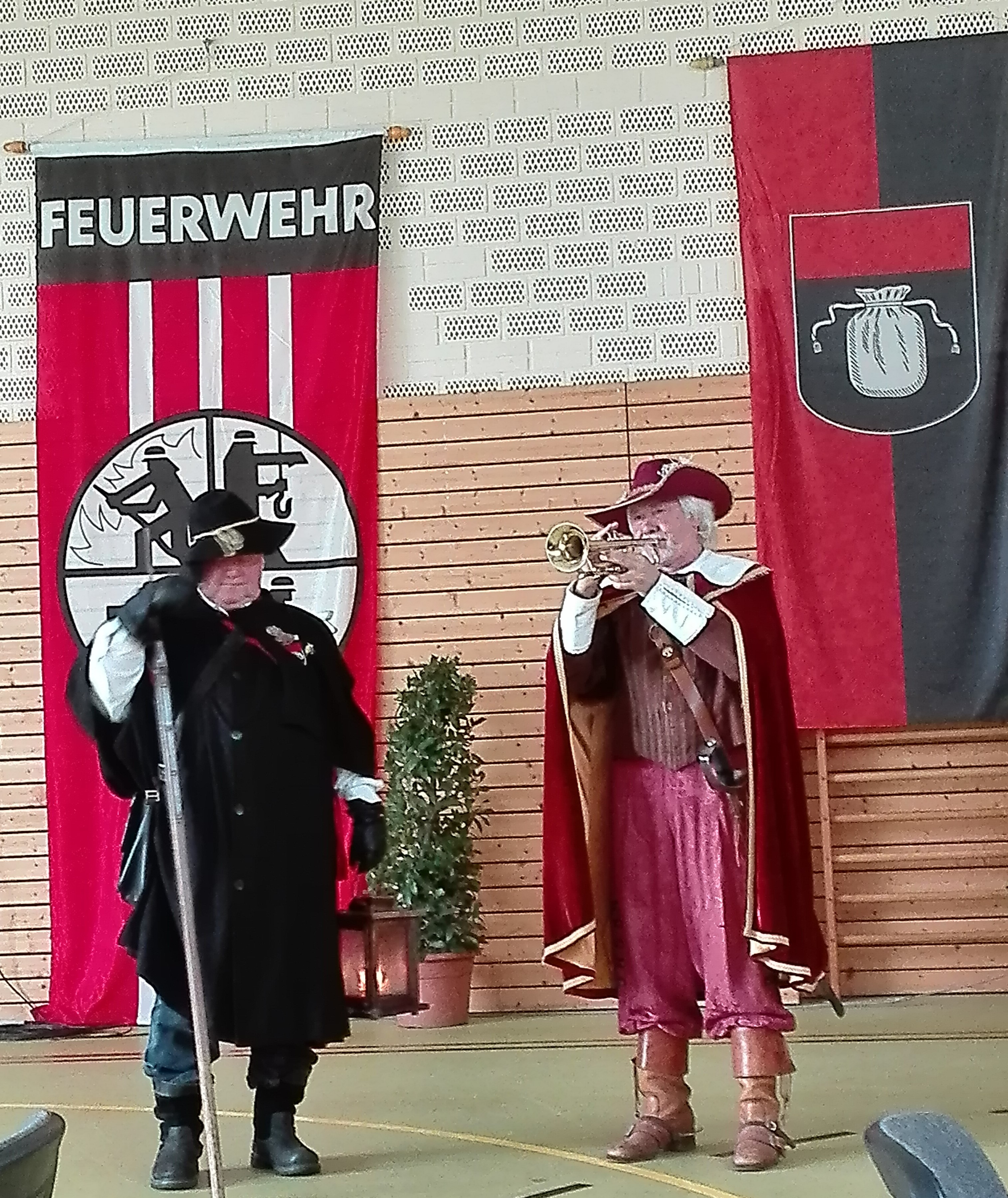 Nach Kaffee und Kuchen, sowie musikalischer Unterhaltung hatten wir Gelegenheit für Gespräche mit bekannten Kameraden aus dem Kreisgebiet. Grußworte vom Bürgermeister Alexander Guhl, eine kleine Chronic vom Ortsvorsteher von Wallbach sowie Grußworte vom Kommandant Tobias Förster, vom Kreisobmann Erhard Heide, vom Kreisverbandsvorsitzenden Ralf Rieple waren auf der Tagesordnung.Bevor wir den traditionellen Wurstsalat serviert bekamen, hat der Nachtwächter ( Hans-Martin Vögtle ) Geschichten aus der Stadt und vom geheimnisvollen "Kater Hiddigeigei" zum Besten gegeben. Der " Trompeter von Säckingen " ( Heinz Blum) hat uns das Behüt Dich Gott vorgetragen.
