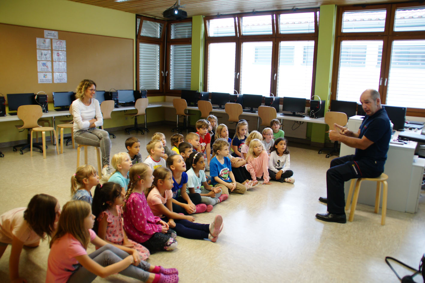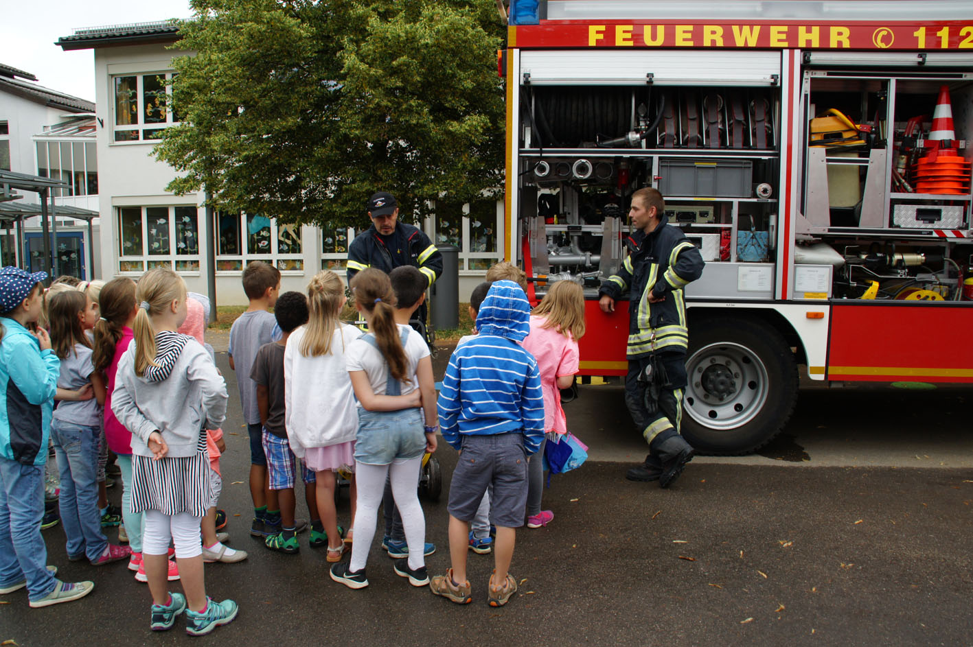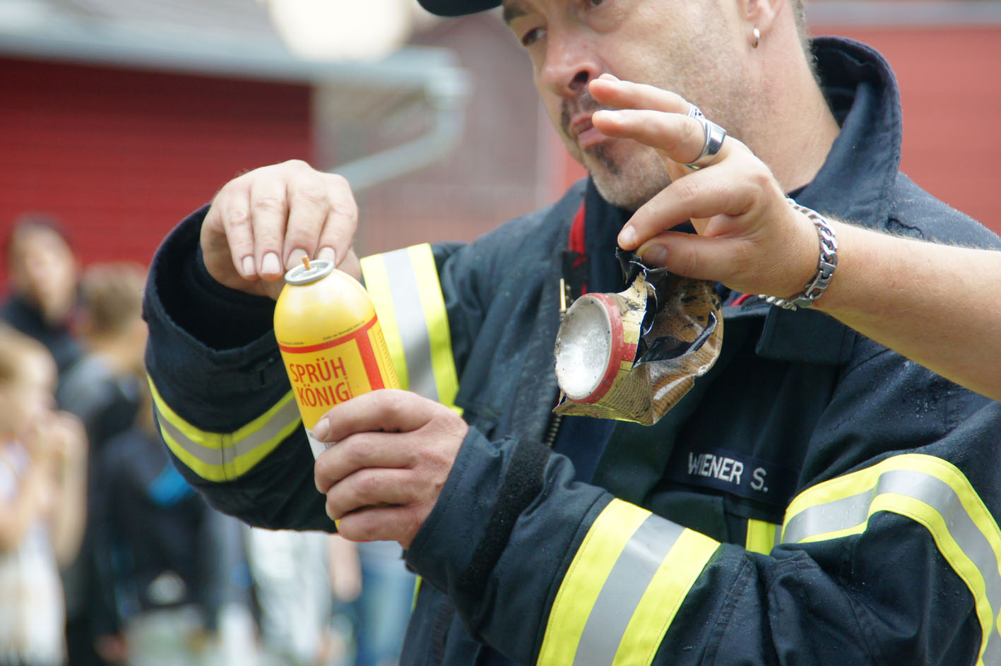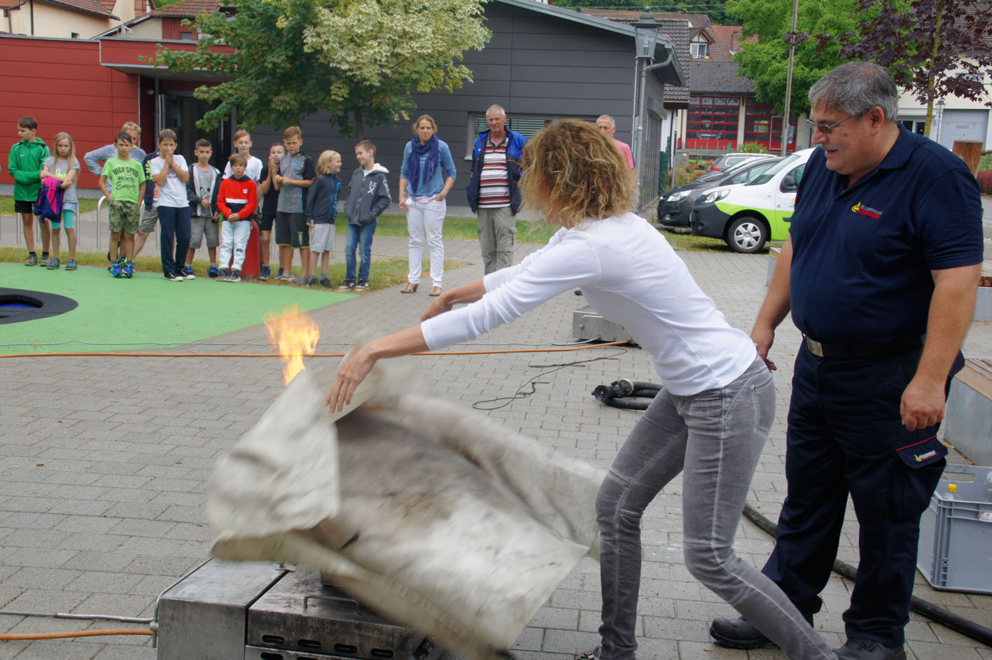 Das Highlight bildete allerdings der Teil mit den Feuerwehrkameraden aus Bad Zurzach, die lautstark Spraydosen zur Explosion brachten. Unter großem Applaus ihrer gesamten Schülerschaft durften abschließend auch die Lehrerinnen selbst Hand anlegen und den Umgang mit Löschdecke und Feuerlöscher üben. Alle Beteiligten, sowohl die Schüler und Lehrer von der Grundschule als auch die Feuerwehrausbilder, hatten großen Spaß an diesem Tag.