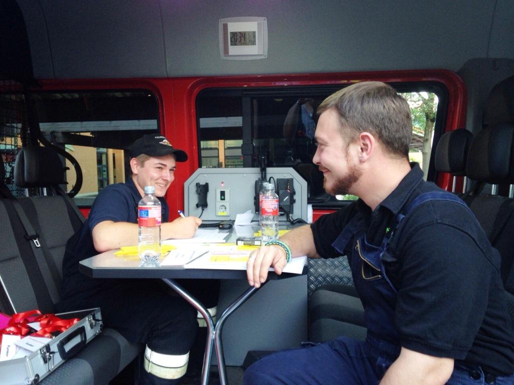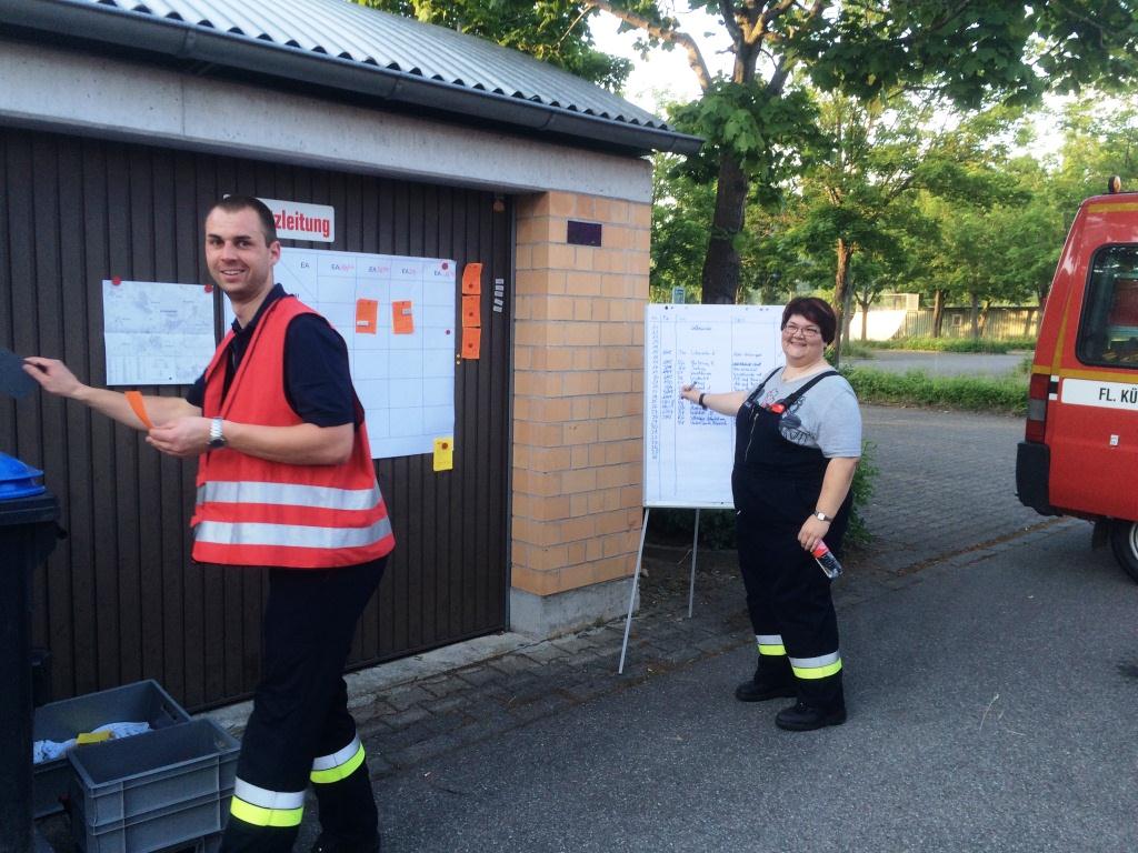Die beiden Sprechfunkausbilder Heiko Martini und Rolf Küpfer legten im Vorfeld bereits etliche verschiedene Unwettereinsätze, wie beispielsweise vollgelaufene Keller, Bäume über Straßen, eingeschlossene Personen, Tiere in Not, kleinere Brandeinsätze usw. an. Diese wurden dann in unregelmäßigen Abständen an die Einsatzleitung durchgegeben.