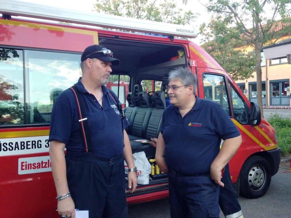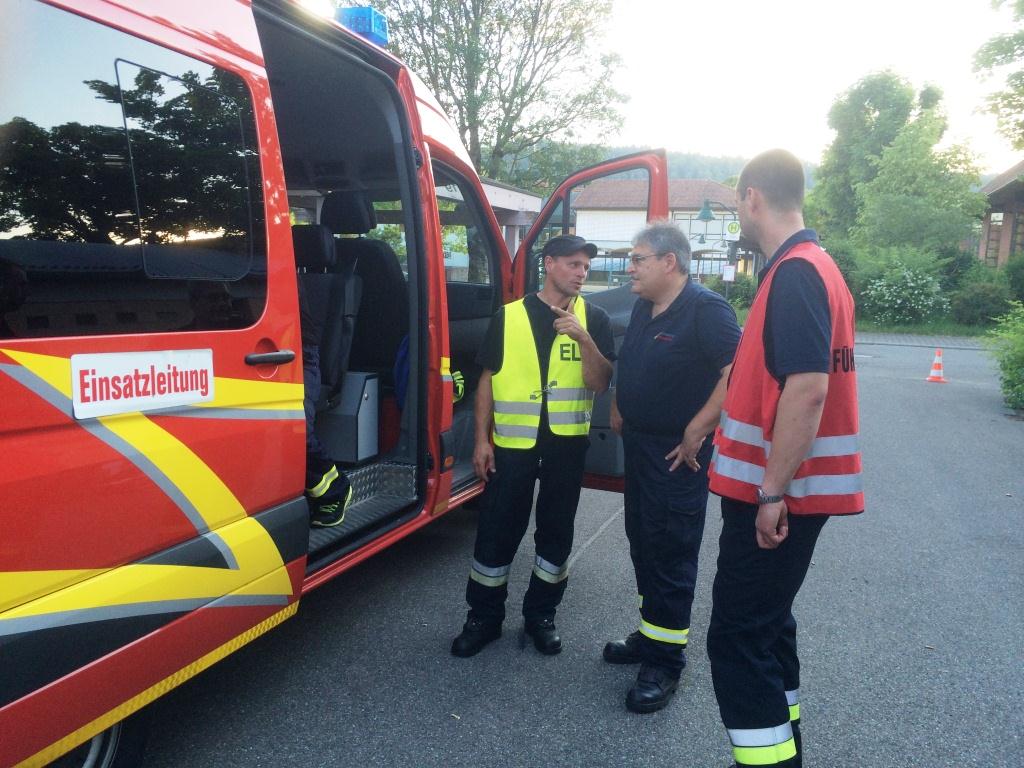 Um das immense Aufgabenspektrum erfolgreich zu bewältigen, wurde Einsatzleiter Sven Haberstock durch eine kleine Führungsgruppe bestehend aus drei Funkern/Meldern, einer Lagekartenführerin sowie dem Leiter der Führungsgruppe, Zugführer Tobias Gisy, unterstützt. Neben der Dokumentation der ganzen Lagemeldungen waren auch die Nachforderungen von weiteren Einsatzkräften und anderen Hilfsorganisationen deren Aufgabe. Auch war zwischendurch die Presse mit einem „Kamerateam“, gespielt von den Übungsorganisatoren Rolf Küpfer und Klaus Klauser, vor Ort und informierte sich über die aktuelle Lage im Unwettergebiet Küssaberg…